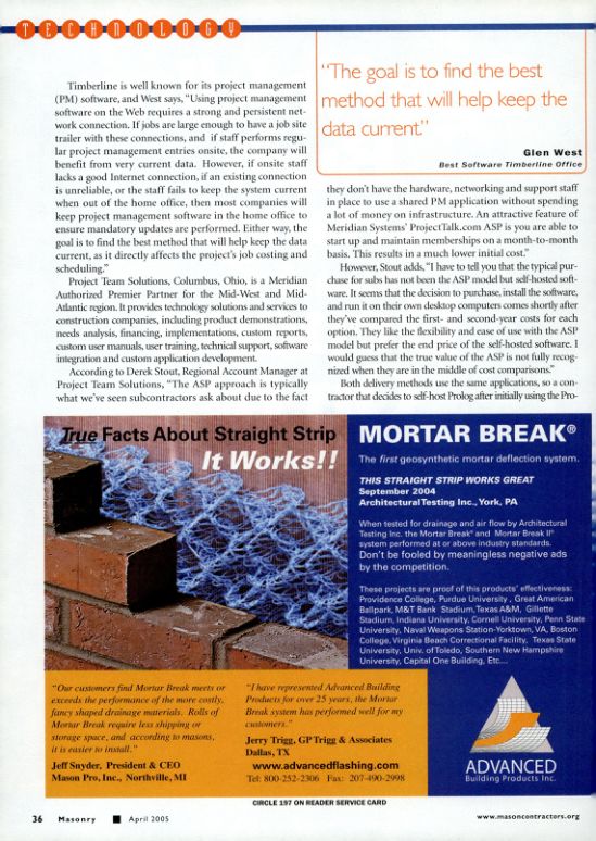 "Our customers find Mortar Break meets or exceeds the performance of the more costly, fancy shaped drainage materials. Rolls of Mortar Break require less shipping or storage space, and according to masons, it is easier to install." Jeff Snyder, President & CEO Mason Pro, Inc., Northville, MI "I have represented Advanced Building Products for over 25 years, the Mortar Break system has performed well for my customers." Jerry Trigg, GP Trigg & Associates Dallas, TX