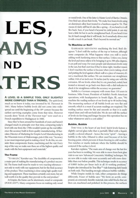Since they've been around for hundreds of years and haven't changed much in principle over that time, comparing today's level with one from the 1700s wouldn't point up the real difference: the accuracy built in from quality manufacturing, Al Karraker, Director of Marketing for Empire Level Manufacturing in the Wisconsin town of Mukwonago, puts it this way: "Accuracy is our most important goal in making a level. To do this, we consider three components: frame, machining and the vial. Every step of the way, we make sure these are of the highest quality and made with the best equipment and materials"