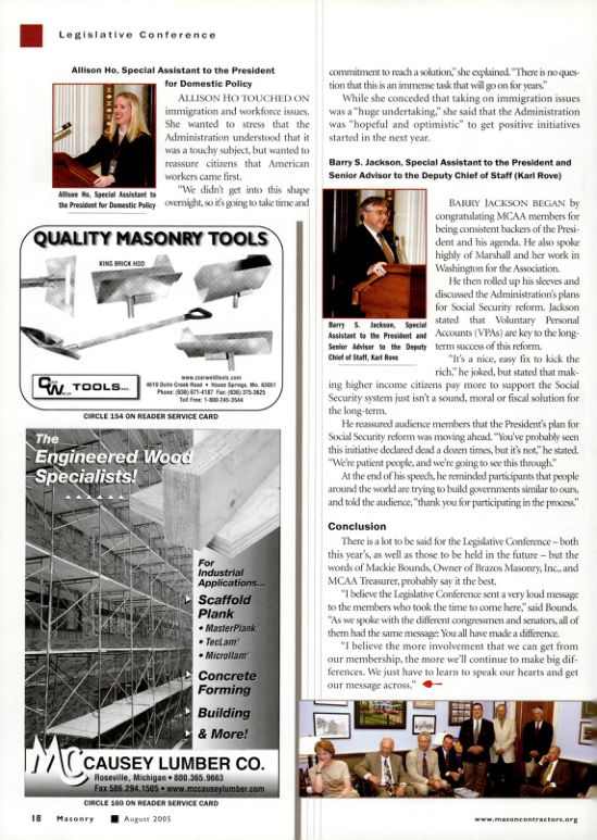 There is a lot to be said for the Legislative Conference-both this year's, as well as those to be held in the future - but the words of Mackie Bounds, Owner of Brazos Masonry, Inc., and MCAA Treasurer, probably say it the best.