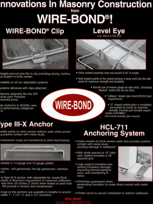 * Straight-and-cut wire fits in clip providing strong, continuous system in brick veneer.
