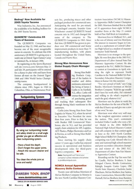 Twenty-year-old Joshua Morrison of McGee Brothers Company in Monroe is the new North Carolina Masonry Contractors Association (NCMCA) Masonry Apprentice Skills Contest Champion for 2005. Morrison finished first in a field of 31 apprentices from eight NCMCA member firms at the May 21 contest held at Pine Hall Brick in Greensboro.