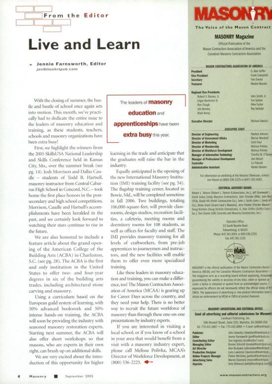 First, we highlight the winners from the 2005 SkillsUSA National Leadership and Skills Conference held in Kansas City, Mo., over the summer break (see pg. 14). Josh Morrison and Dallas Caudle students of Todd B. Hartsell, masonry instructor from Central Cabarrus High School in Concord, N.C.- took home the first place honors in the post-secondary and high school competitions. Morrison, Caudle and Hartsell's accomplishments have been heralded in the past, and we certainly look forward to watching their stars continue to rise in the future.
