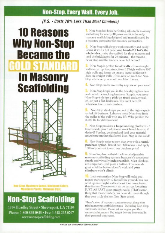 There's a ton of masonry contractors out there who tried numerous scaffold systems including Non-Stop and mast climbers. Please ask us to give you their names and numbers. You might be very interested in their personal comments.