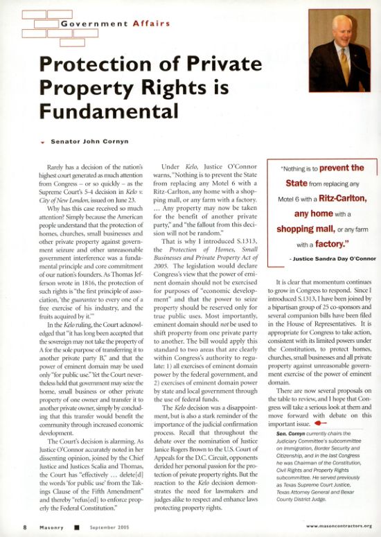 The Kelo decision was a disappointment, but is also a stark reminder of the importance of the judicial confirmation process. Recall that throughout the debate over the nomination of Justice Janice Rogers Brown to the U.S. Court of Appeals for the D.C. Circuit, opponents derided her personal passion for the protection of private property rights. But the reaction to the Kelo decision demonstrates the need for lawmakers and judges alike to respect and enhance laws protecting property rights.