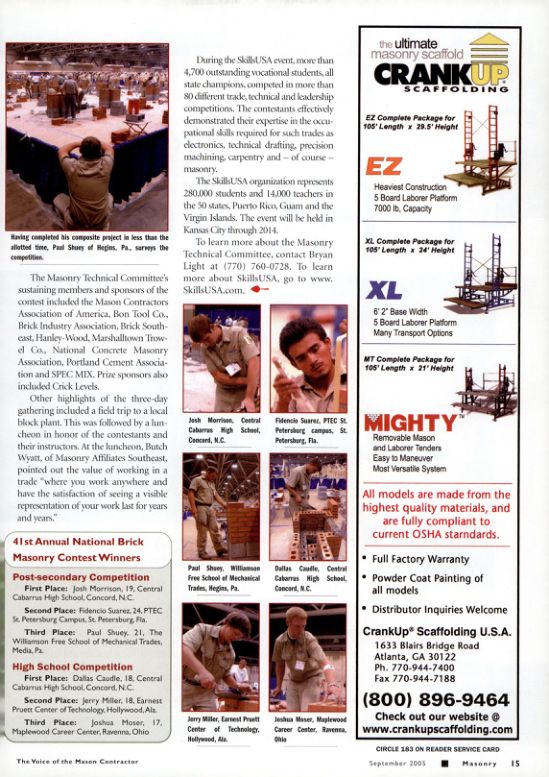 To learn more about the Masonry Technical Committee, contact Bryan Light at (770) 760-0728. To learn more about SkillsUSA, go to www.SkillsUSA.com.