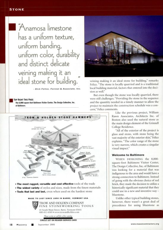 WHEN DESIGNING the 8,000-square-foot Baltimore Visitor Center, The Design Collective, Inc. of Baltimore was looking for a material that was indigenous to the area and would have a strong connection to Baltimore. Instead of going with the obvious choice of red brick, they made the decision to utilize a historically significant material that they could use in a new and inventive way-bluestone.