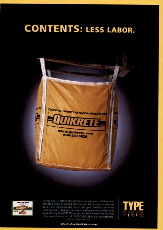 Get QUIKRETE Mason Mix and stop worrying about adding sand, consistent mixes or product delivery time. We can even custom mix our precise factory-blended mortar with your specified colors and water repellents. And we'll be there to answer questions and give you quick delivery. QUIKRETE Mason Mix. Available everywhere. To order, or for more information call 1-800-282-5828 or visit quikrete.com. 2004 THE QUIERETE Comp