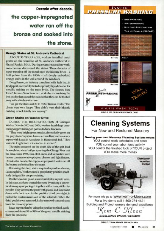 DURING THE RECONSTRUCTION of Chicago's Wacker Drive in 2003 and 2004, workers faced deep, penetrating copper staining on porous Indiana limestone.