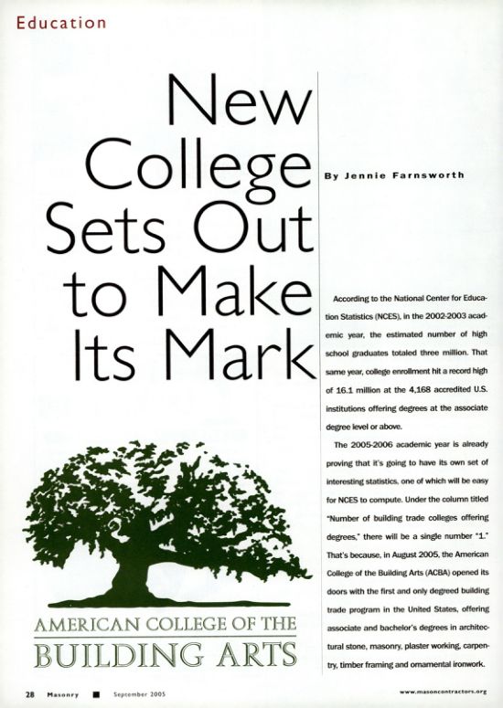 The 2005-2006 academic year is already proving that it's going to have its own set of interesting statistics, one of which will be easy for NCES to compute. Under the column titled "Number of building trade colleges offering degrees," there will be a single number "1." That's because, in August 2005, the American College of the Building Arts (ACBA) opened its doors with the first and only degreed building trade program in the United States, offering associate and bachelor's degrees in architectural stone, masonry, plaster working, carpentry, timber framing and omamental ironwork.