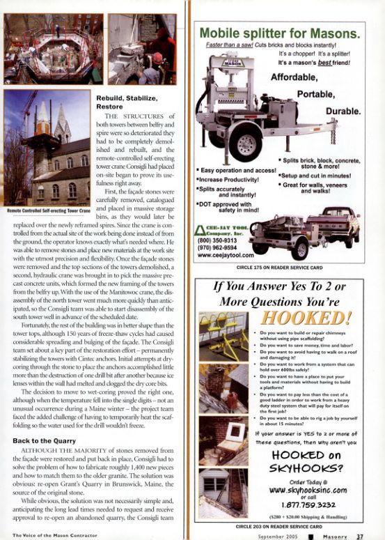 If your answer is YES to 2 or more of these questions, then why aren't you HOOKED on SKYHOOKS? Order Today www.skyhooksinc.com or call 1.877.759.3232 (5280+520.00 Shipping & Handling) CIRCLE 203 ON READER SERVICE CARD September 2005 Masonry 37