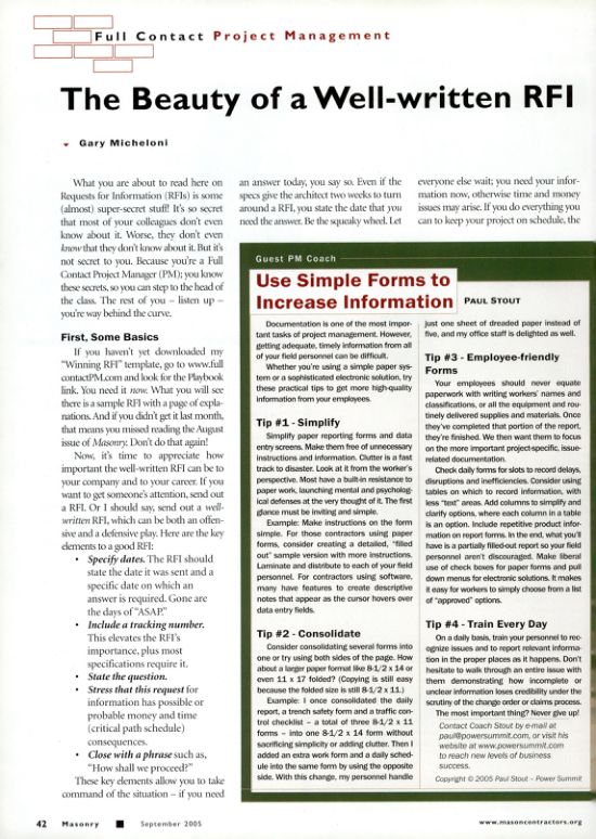 If you haven't yet downloaded my "Winning RFI" template, go to www.full contactPM.com and look for the Playbook link. You need it now. What you will see there is a sample RFI with a page of explanations. And if you didn't get it last month, that means you missed reading the August issue of Masonry. Don't do that again!