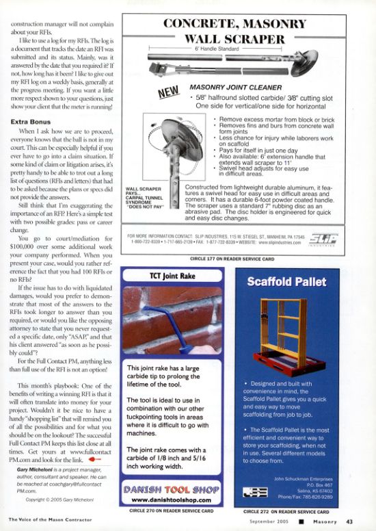 This month's playbook: One of the benefits of writing a winning RFI is that it will often translate into money for your project. Wouldn't it be nice to have a handy "shopping list" that will remind you of all the possibilities and for what you should be on the lookout? The successful Full Contact PM keeps this list close at all times. Get yours at www.fullcontact PM.com and look for the link.