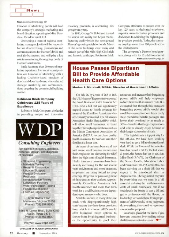 On July 26, by a vote of 263 to 165, the U.S. House of Representatives passed the Small Business Health Fairness Act (H.R. 525), a bill that will significantly expand access to health coverage for many of the 45 million Americans who are currently uninsured. The bill creates Association Health Plans (AHPs), which will allow small businesses to band together through organizations such as the Mason Contractors Association of America (MCAA) to purchase quality health insurance for workers and their families at a lower cost.