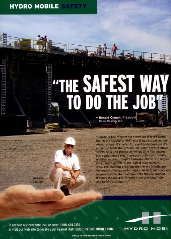 Ronald Clough: "Safety is the main reason why we started using the Hydro Mobile in 1997 and it has surpassed our expectations. It's safer for everybody because it's all set up from the ground. We don't need to move safety rails and planks as we go up which makes the equipment safer, more productive and totally eliminates pinch fingers between planks! On higher jobs, Hydro Mobile is the safest way to work. Also, the training program that Hydro Mobile and Vanguard offer is really helpful. In fact, we don't let anyone handle the machine until they're trained. It really makes a difference from a productivity and safety standpoint."