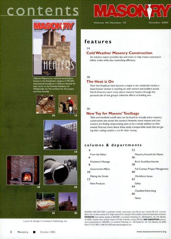 MASONRY ISSN 0025-4681) is published monthly Subscription rate $20 per year: Canada $30 (0.5. спеку Mexico $32, all other countries $79. Single copies $5.50. Copyright 2005 by Mason Contractors Association of America