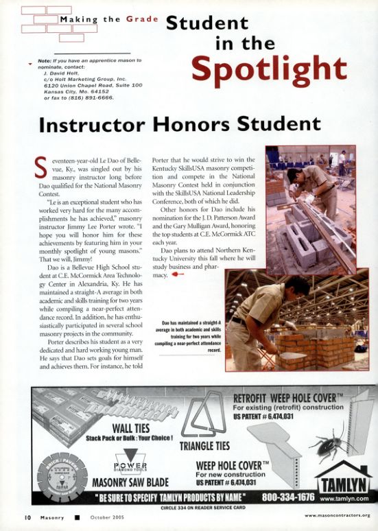"Le is an exceptional student who has worked very hard for the many accomplishments he has achieved," masonry instructor Jimmy Lee Porter wrote. "I hope you will honor him for these achievements by featuring him in your monthly spotlight of young masons." That we will, Jimmy!