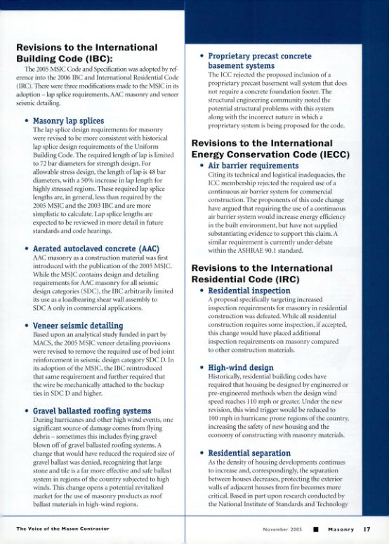 The 2005 MSJC Code and Specification was adopted by reference into the 2006 IBC and International Residential Code (IRC). There were three modifications made to the MSJC in its adoption-lap splice requirements, AAC masonry and veneer seismic detailing.