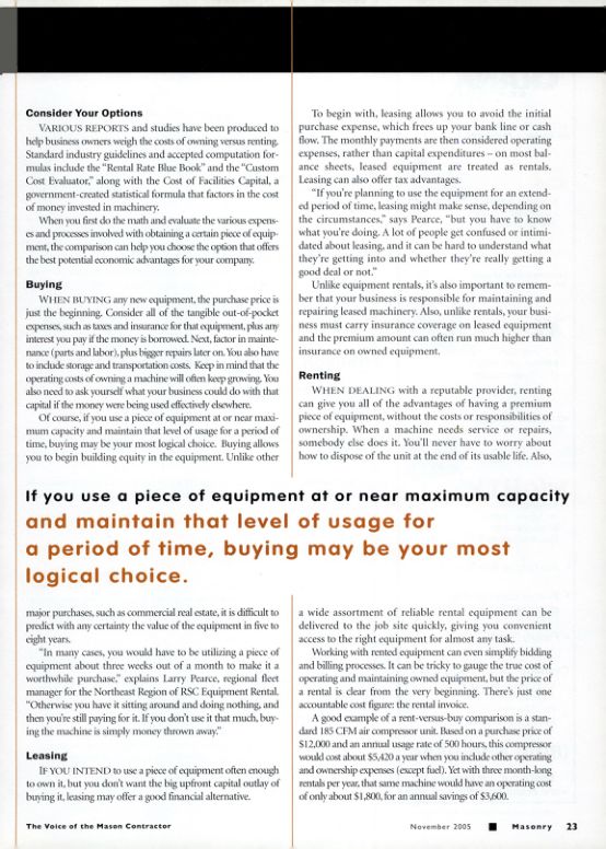 "In many cases, you would have to be utilizing a piece of equipment about three weeks out of a month to make it a worthwhile purchase," explains Larry Pearce, regional fleet manager for the Northeast Region of RSC Equipment Rental. "Otherwise you have it sitting around and doing nothing, and then you're still paying for it. If you don't use it that much, buying the machine is simply money thrown away."
