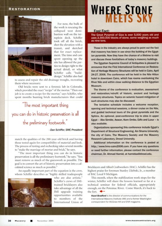 This month, when the stabilization work stops for the winter, Schiffer will share the lessons learned so far at a technical seminar for federal officials, appropriately enough, on the Potomac River. Come March, it's back to the fort.
