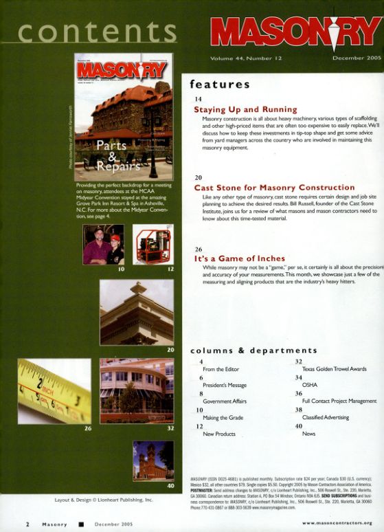 MASONRY (SSN 0025-4681) is published monthly Subscription rate $24 per year: Canada $30 (U.S.cuency Mexico $32, all other countries $79. Single copies $5.50. Copyright 2005 by Mason Contactors Association of America POSTMASTER: Send address changes to MASONRY, Linear Publishing, 506 Roswell St, St 220, Marietta GA 30060. Canadian address: Station A, PO Box 54 Windsor Ontario 65. SEND SUBSCRIPTIONS and business correspondence to MASONRY, c/o Lionheart Publishing, Inc., 506 Roswell St., Ste. 220, Marietta, GA 30060 Phone: 770-431-0867 or 888-303-5639 wwк лакочупаралее.сов.