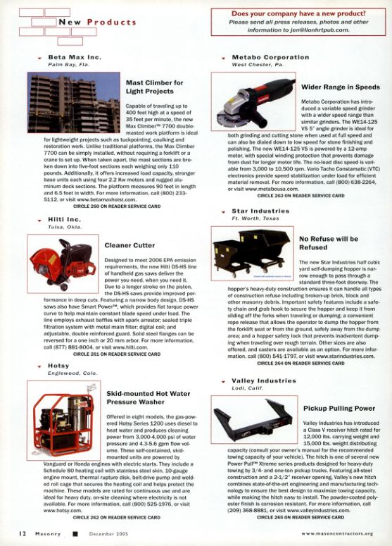 Designed to meet 2006 EPA emission requirements, the new Hilti DS-HS line of handheld gas saws deliver the power you need, when you need it. Due to a longer stroke on the piston, the DS-HS saws provide improved performance in deep cuts. Featuring a narrow body design, DS-HS saws also have Smart Power™, which provides flat torque power curve to help maintain constant blade speed under load. The line employs exhaust baffles with spark arrestor, sealed triple filtration system with metal main filter, digital coil; and adjustable, double reinforced guard. Solid steel flanges can be reversed for a one inch or 20 mm arbor. For more information. call (877) 881-8004, or visit www.hilti.com.