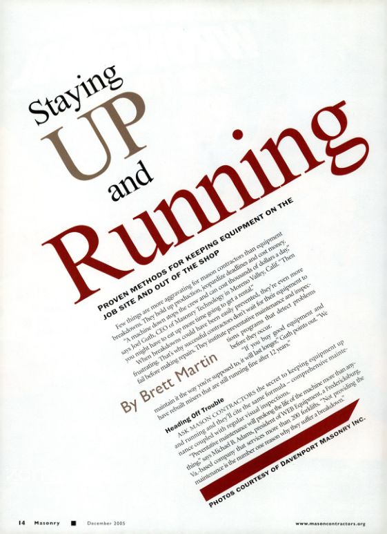 Few things are more aggravating for mason contractors than equipment breakdowns. They hold up production, jeopardize deadlines and cost money. "A machine down stops the crew and can cost thousands of dollars a day," says Joel Guth, CEO of Masonry Technology in Moreno Valley, Calif. "Then you might have to eat up more time going to get a rental."