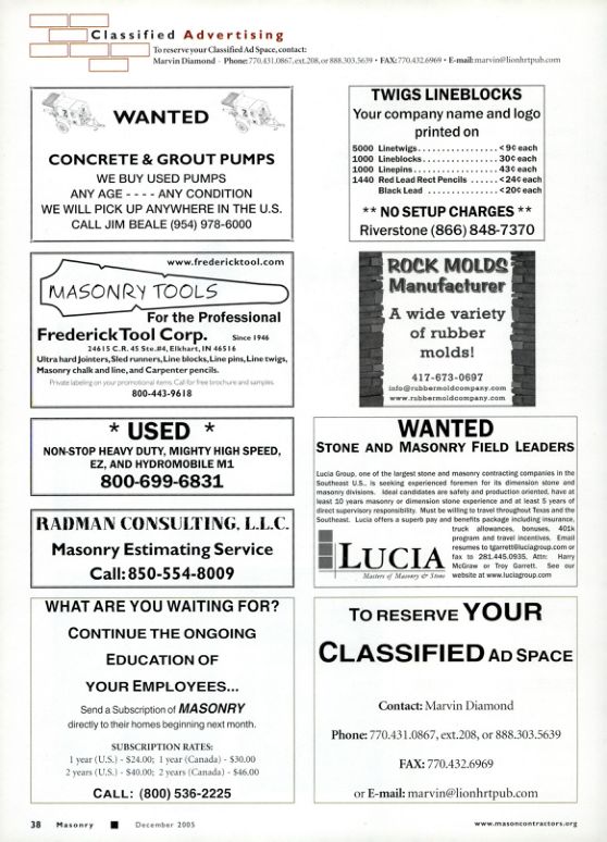 Lucia Group, one of the largest stone and masonry contracting companies in the Southeast U.S., is seeking experienced foremen for its dimension stone and masonry divisions. Ideal candidates are safety and production oriented, have at least 10 years masonry or dimension stone experience and at least 5 years of direct supervisory responsibility. Must be willing to travel throughout Texas and the Southeast. Lucia offers a superb pay and benefits package including insurance, truck allowances, bonuses, 401k program and travel incentives. Email resumes to tgarrett@luciagroup.com or fax to 281.445.0935, Atm: Hamy McGraw or Troy Garrett. See our website at www.lucilagroup.com