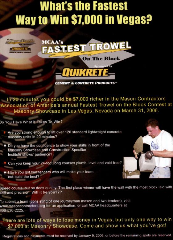 In 20 minutes you could be $7,000 richer in the Mason Contractors Association of America's annual Fastest Trowel on the Block Contest at Masonry Showcase in Las Vegas, Nevada on March 31, 2006.