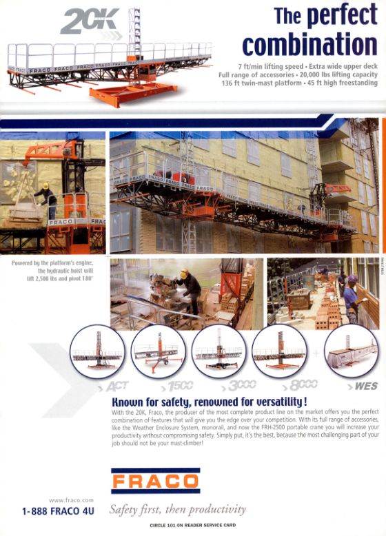 With the 20K, Fraco, the producer of the most complete product line on the market offers you the perfect combination of features that will give you the edge over your competition. With its full range of accessories, like the Weather Enclosure System, monorail, and now the FRH-2500 portable crane you will increase your productivity without compromising safety. Simply put, it's the best, because the most challenging part of your job should not be your mast-climber!