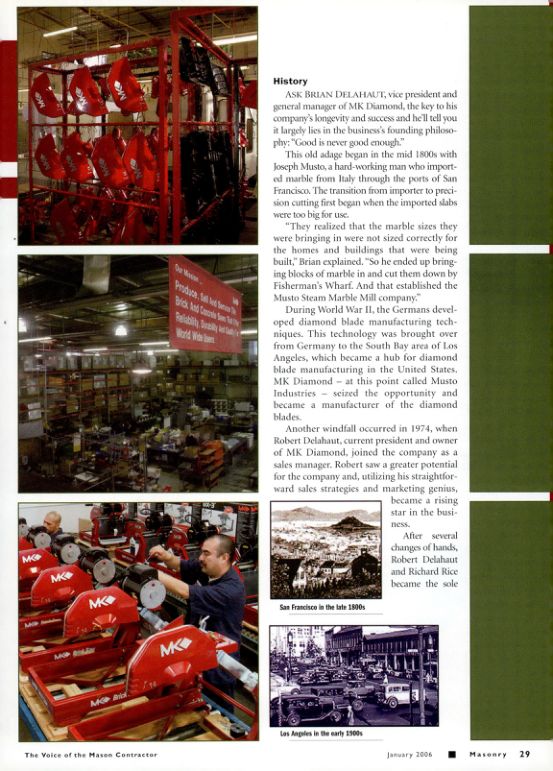 During World War II, the Germans developed diamond blade manufacturing techniques. This technology was brought over from Germany to the South Bay area of Los Angeles, which became a hub for diamond blade manufacturing in the United States. MK Diamond at this point called Musto Industries seized the opportunity and became a manufacturer of the diamond blades.