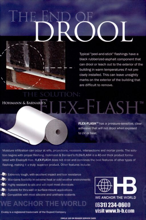 Moisture infiltration can occur at sills, projections, recesses, intersections and mortar joints. The solution begins with proper flashing. Hohmann & Barnard's FLEX-FLASH is a 40-mil thick product formulated with Elvaloy® Kee. FLEX-FLASH does not drool and combines the best features of other types of flashing, making it a truly superior product. Other features include: