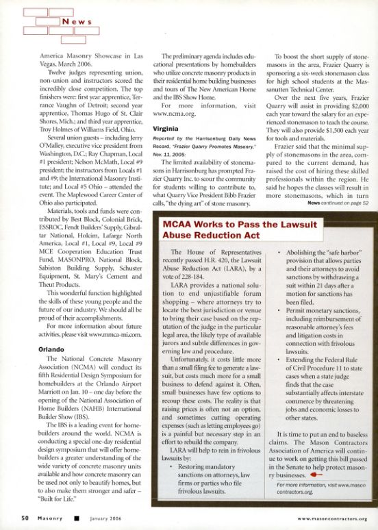 Reported by the Harrisonburg Daily News Record, "Frazier Quarry Promotes Masonry." Nov. 11, 2005: