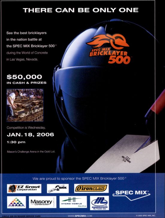 We are proud to sponsor the SPEC MIX Bricklayer 500. EZ Grout Corporation RICK BironCLAD SPEC MIX Masonry Construction IL HYDRO MOBILE MARSHALLTOWN CIRCLE 228 ON READER SERVICE CARD WWW.SPECMIX.COM 2005 SPEC MIX, INC.