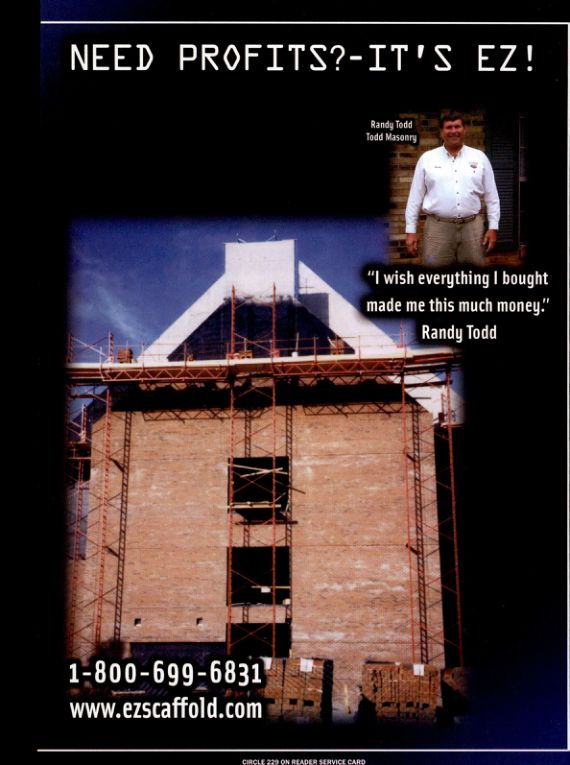Masonry Magazine January 2006 Page. 57 Masonry Magazine January 2006 Page. 57 NEED PROFITS?-IT'S EZ!1-800-699-6831www.ezscaffold.comCIRCLE 229 ON READER SERVICE CARDRandy ToddTodd Masonry"I wish everything I bought made me this much money."Randy Todd