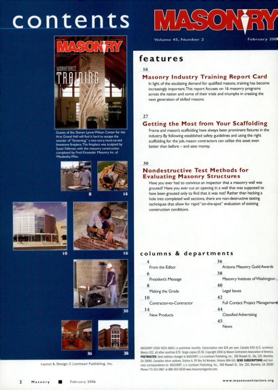 MASONRY (155N 0025-4681) is published mormy Satsongtion rate $24 per year, Canada $30 (1.5. currency Mexico $32, all other countries $79. Single copies $5.50. Copyright 2006 by Mason Contractors Association of America POSTMASTER: Send address changes to MASONRY, c/o Lionheart Publishing, Inc., 506 Roswell St., Ste. 220. Marietta GA 30000. Canadian turn address: Station A, PO Box 54 Windsor, Ontario NDA 65 SEND SUBSCRIPTIONS and b ness comespondence toc MASONRY, c/o Lionheart Publishing, Inc., 506 Roswell St, Ste. 220, Marietta, GA 30060 Phone: 770-431-0867 or 888-303-5639 www.asomymagazine.com.