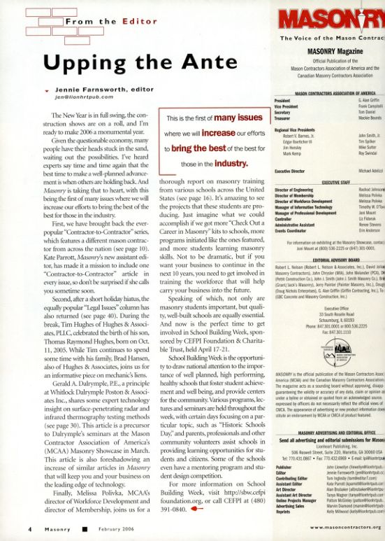 The New Year is in full swing, the construction shows are on a roll, and I'm ready to make 2006 a monumental year. Given the questionable economy, many people have their heads stuck in the sand, waiting out the possibilities. I've heard experts say time and time again that the best time to make a well-planned advancement is when others are holding back. And Masonry is taking that to heart, with this being the first of many issues where we will increase our efforts to bring the best of the best for those in the industry.