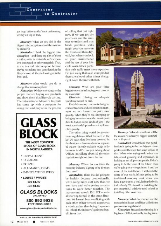 Kinateder: I think that it's going to be healthy, because promotionally, we're doing more stuff now than we ever have and we're getting associations to work better together. The mason contractor's, IMI, ICE-we're all starting to pull in the same direction. We haven't been conflicting with each other. When we work together as a whole, rather than being fragmented, I think the industry's going to benefit from that.