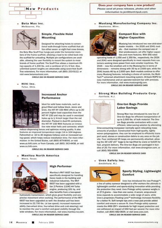 Ideal for solid base materials, such as grout-filled and hollow block, stone and brick, the HIT HY 150 MAX offers up to 20 percent higher load capacities than the HIT HY 150 and may be used in oversized holes up to 1/4-inch larger than the rod diameter. Packed in dual-fill containers, the HIT HY 150 MAX features an innovative new mixer helix and connector, which reduce dispensing forces and optimize mixing quality. It also features an improved temperature range (14 to 104 degrees Fahrenheit or-10 to 40 degrees Celsius) and an increased curing speed, which helps reduce installation time. For more information: in the United States, call (800) 879-8000, or visit www.us.hilti.com; or from Canada, call (800) 363-4458, or visit www.ca.hilti.com.