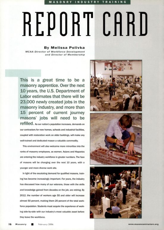 In light of the escalating demand for qualified masons, training has become increasingly important. For years, the industry has discussed how many of our veterans, those with the skills and knowledge gained from decades on the job, are retiring. By 2012, the number of workers age 55 and older will increase almost 50 percent, making them 20 percent of the total workforce population. Students must acquire the experience of working side-by-side with our industry's most valuable asset before they leave the workforce.