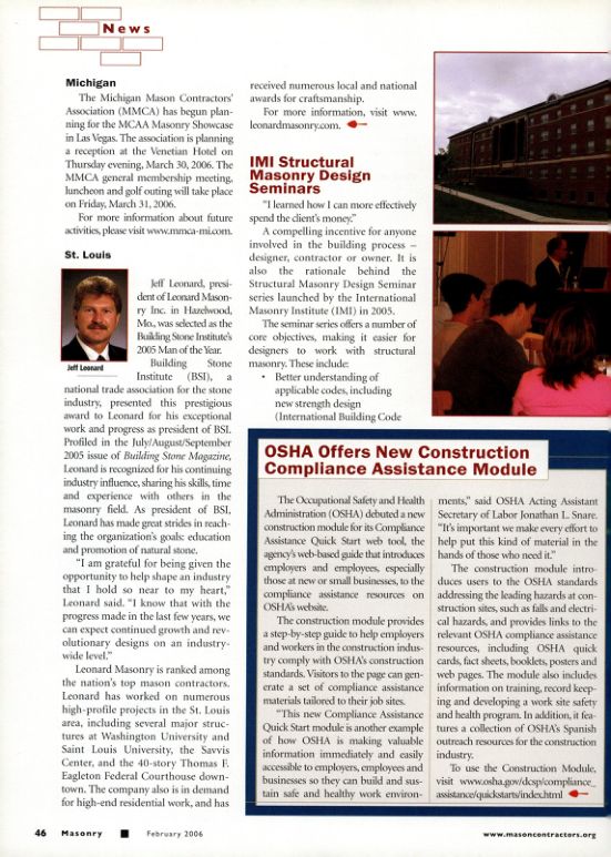 Jeff Leonard, president of Leonard Masonry Inc. in Hazelwood, Mo, was selected as the Building Stone Institute's 2005 Man of the Year. Building Stone Institute (BSI), national trade association for the stone industry, presented this prestigious award to Leonard for his exceptional work and progress as president of BSI. Profiled in the July/August/September 2005 issue of Building Stone Magazine, Leonard is recognized for his continuing industry influence, sharing his skills, time and experience with others in the masonry field. As president of BSI, Leonard has made great strides in reaching the organization's goals: education and promotion of natural stone.