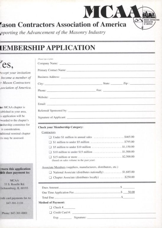 Yes, I accept your invitation to become a member of the Mason Contractors Association of America.