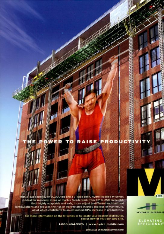 With a load capacity of 20,000 lbs and a 7' wide deck, Hydro Mobile's M-Series is ideal for masonry, stone or marble facade work from 20' to 250' in height.