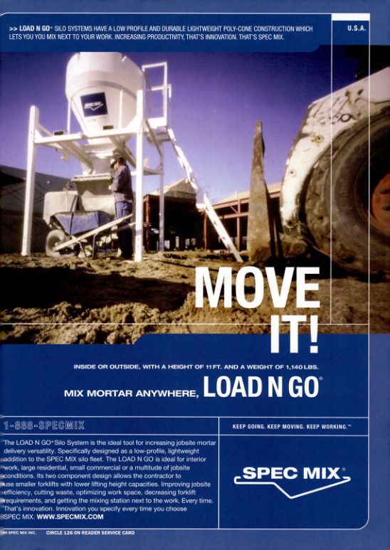 The LOAD N GO" Silo System is the ideal tool for increasing jobsite mortar delivery versatility. Specifically designed as a low-profile, lightweight addition to the SPEC MIX silo fleet. The LOAD N GO is ideal for interior work, large residential, small commercial or a multitude of jobsite conditions. Its two component design allows the contractor to use smaller forklifts with lower lifting height capacities. Improving jobsite efficiency, cutting waste, optimizing work space, decreasing forklift requirements, and getting the mixing station next to the work. Every time. That's innovation. Innovation you specify every time you choose SPEC MIX. WWW.SPECMIX.COM