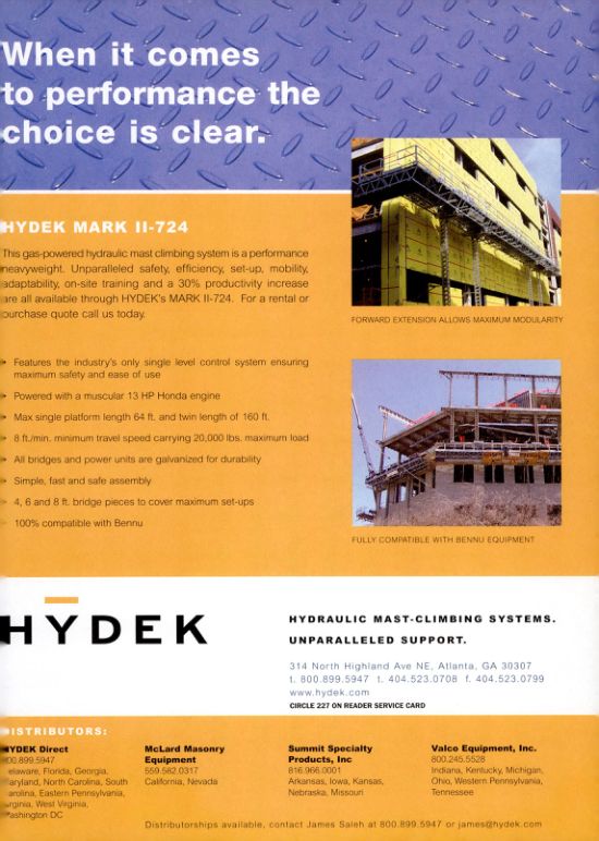 This gas-powered hydraulic mast climbing system is a performance heavyweight. Unparalleled safety, efficiency, set-up, mobility, adaptability, on-site training and a 30% productivity increase are all available through HYDEK's MARK II-724. For a rental or purchase quote call us today.
