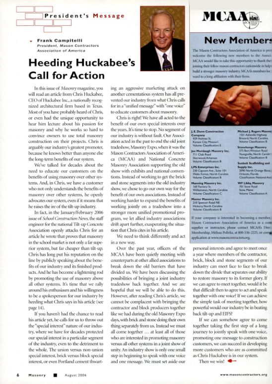 In fact, in the January/February 2006 issue of School Construction News, the staff engineer for the national Tilt-up Concrete Association openly attacks Chris for an article he wrote that proves that masonry in the school market is not only a far superior system, but far cheaper than tilt-up. Chris has long put his reputation on the line by publicly speaking about the benefits of our industry and its finished products. And he has become a lightening rod by promoting the use of masonry above all other systems. It's time that we rally around his enthusiasm and his willingness to be a spokesperson for our industry by heeding what Chris says in his article (see page 14).