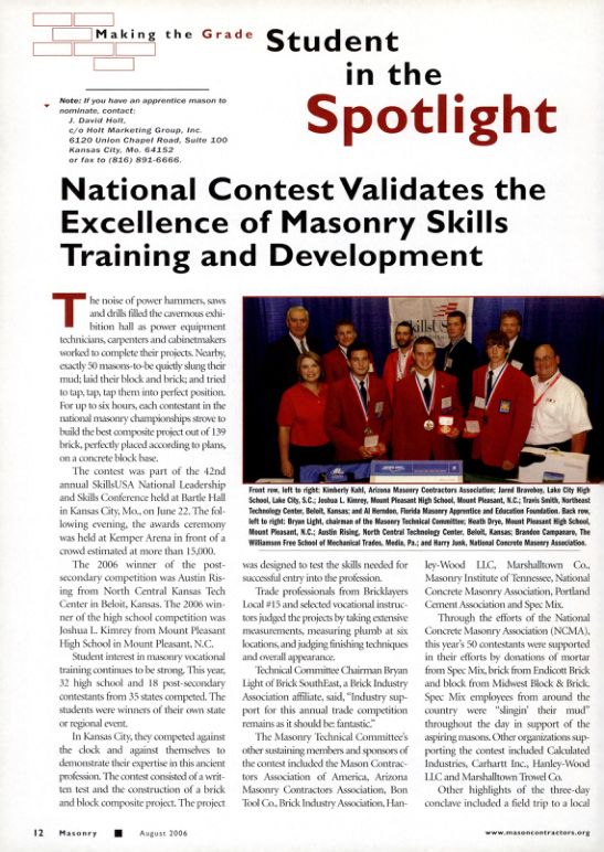 The Masonry Technical Committee's other sustaining members and sponsors of the contest included the Mason Contractors Association of America, Arizona Masonry Contractors Association, Bon Tool Co., Brick Industry Association, Hanley-Wood LLC, Marshalltown Co., Masonry Institute of Tennessee, National Concrete Masonry Association, Portland Cement Association and Spec Mix.