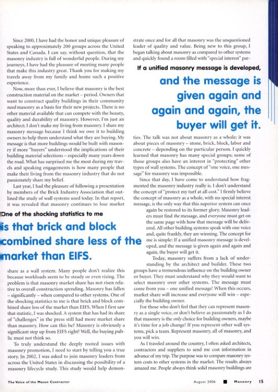 Since that day, I have come to understand how fragmented the masonry industry really is. I don't understand the concept of "protect my turf at all cost." I firmly believe the concept of masonry as a whole, with no special interest message, is the only way that this superior system can once again be restored to its former glory. Masonry leaders must find the message, and everyone must get on the same page with how that message will be delivered. All other building systems speak with one voice and, quite frankly, they are winning. The concept for me is simple: If a unified masonry message is developed, and the message is given again and again and again, the buyer will get it.