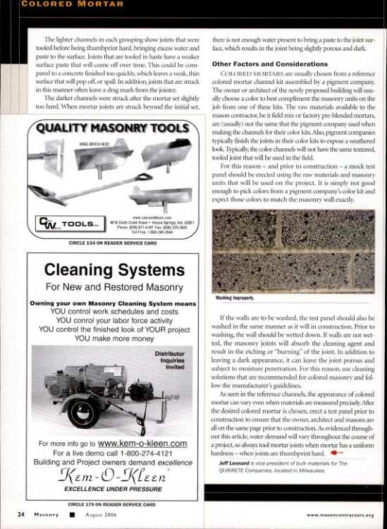 As seen in the reference channels, the appearance of colored mortar can vary even when materials are measured precisely. After the desired colored mortar is chosen, erect a test panel prior to construction to ensure that the owner, architect and masons are all on the same page prior to construction. As evidenced through out this article, water demand will vary throughout the course of a project, so always tool mortar joints when mortar has a uniform hardness-when joints are thumbprint hard.