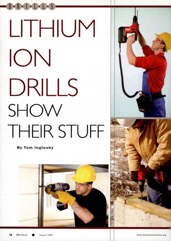 Masonry Magazine August 2006 Page. 28 Masonry Magazine August 2006 Page. 28 DRILLSLITHIUM ION DRILLS SHOW THEIR STUFFBy Tom Inglesby26 Masonry August 2006www.masoncontractors.org