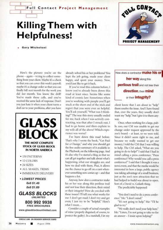 Anyway, how does a contractor make his or her way along this perilous trail and not lose their direction, their mind or their integrity? How do you deal with these issues? I'll tell you what works for me: I don't get mad; I don't try and get even; I just try to be "helpful." Here's what I mean...
